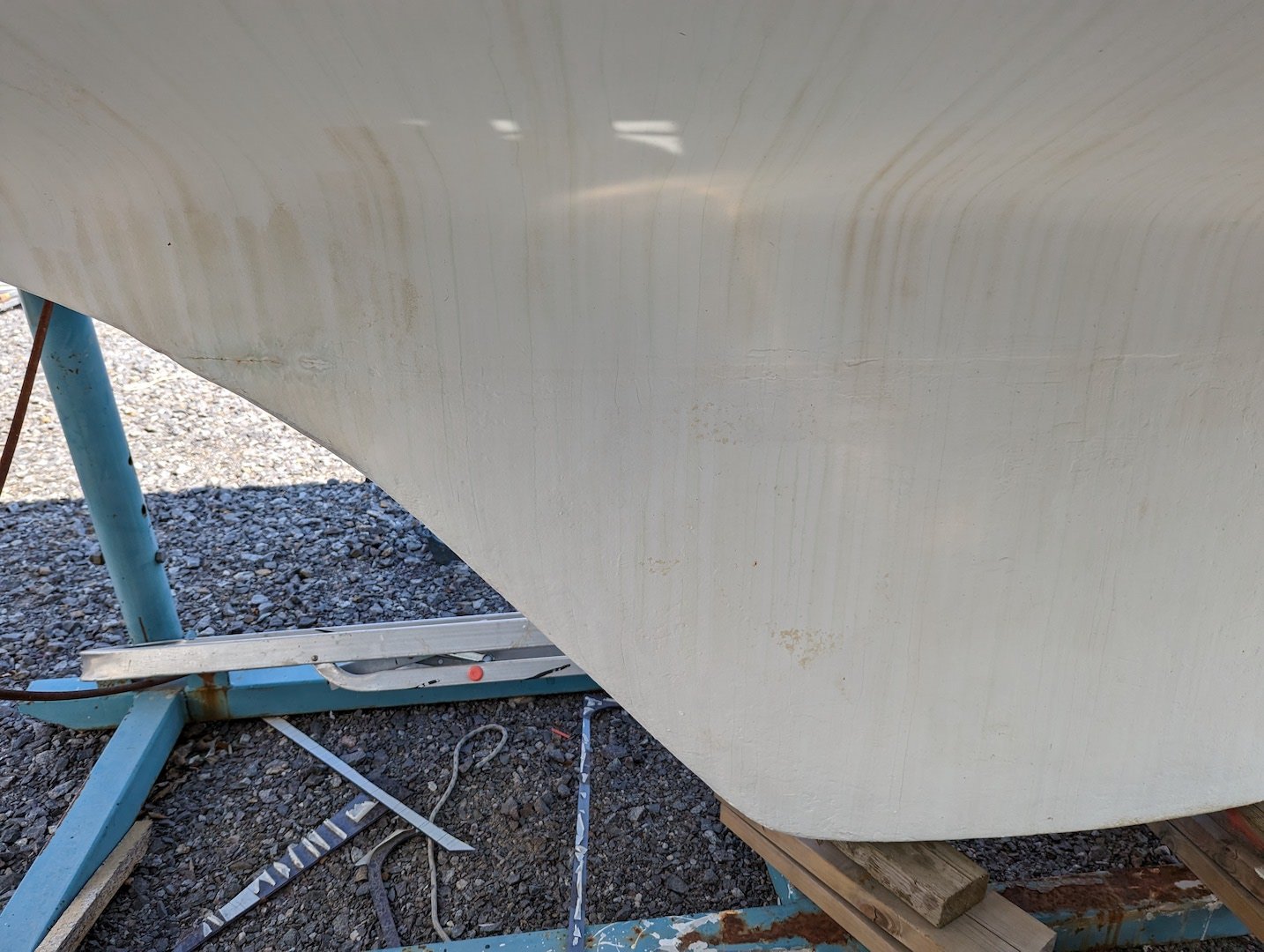 Sama kohta näytti tältä samalta jo ensimmäisen kesän jälkeen kun oli ollut vesillä, silloin ajattelin, että oli vaan jotenkin tehty tuosta kohtaa huonosti ja hioin auki ja laitoin underwater primeriä ja antifoulingia, mutta nyt kun näyttää taas samalta tuntuu siltä, että tässä on ehkä jotain isompaa.
